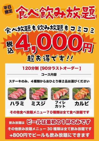 <超划算! ! >僅限工作日,可享120分鐘(最後點餐時間為90分鐘)無限暢飲套餐!這是一個令人興奮的套餐,您可以從四種牛排中每人選擇兩種。 ★ 只包含第一杯啤酒,但只要額外支付 800 日元,您就可以無限暢飲!有 30 種無限暢飲菜單可供選擇。歡迎大家來參加歡迎會、歡送會及其他宴會!